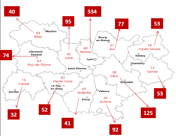 En Auvergne et en Rhône-Alpes, au 1er janvier 2020, ce sont 360 personnes morales regroupant 1 072 établissements et services, ainsi que 63 membres adhérents nationaux qui sont répartis sur les 12 départements de la grande Région.